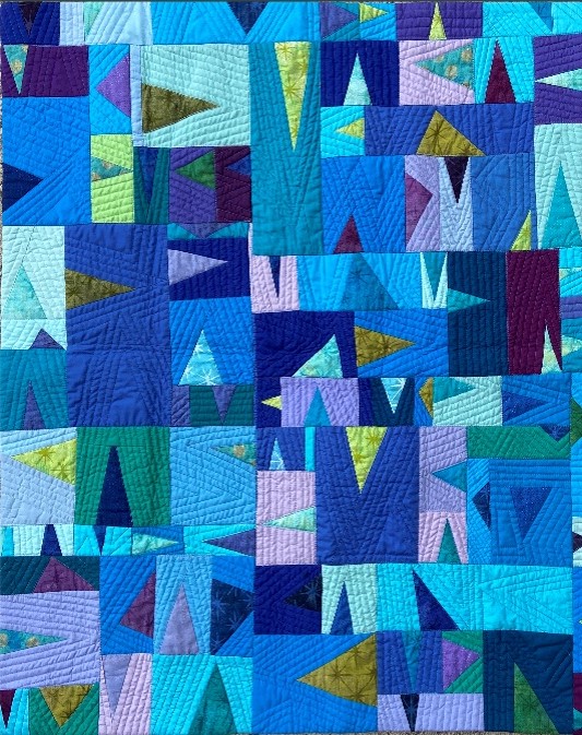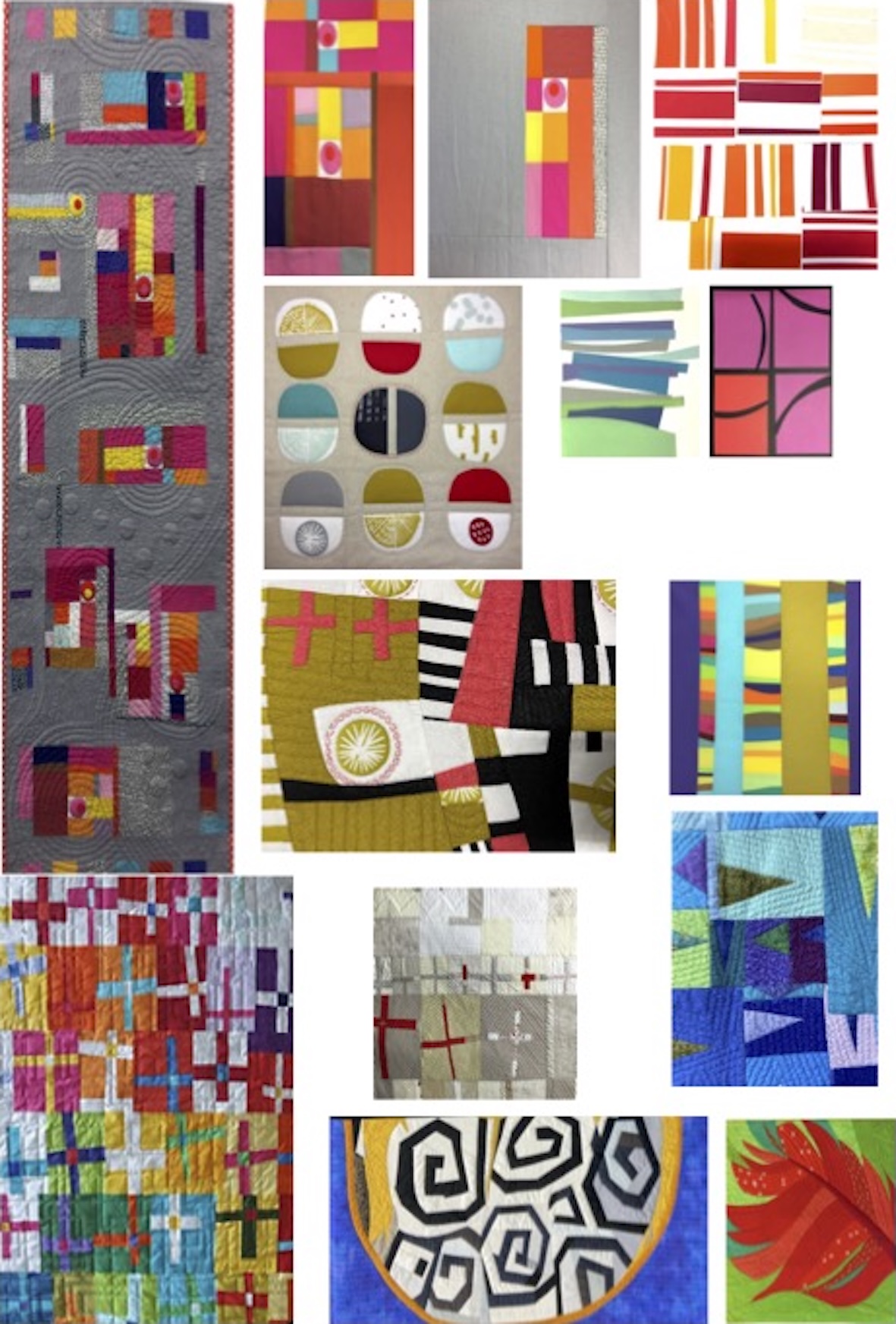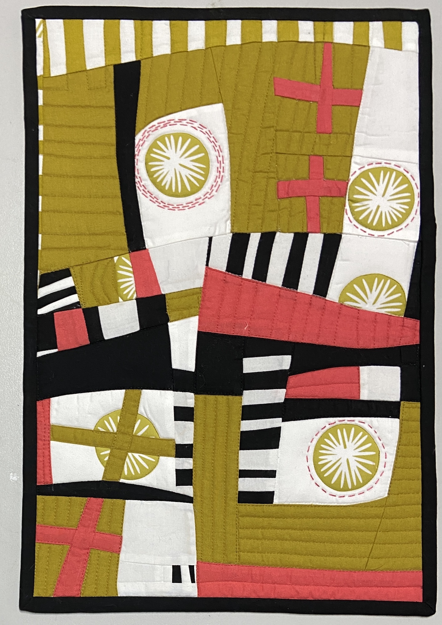 Introduction to improvisational techniques that ‘break the rules’ and encourage spontaneity and freedom… Sound a little scary? As vague as this sounds, there are a multitude of ways to construct, using improvisational processes and in this class, a number of these ‘frameworks’ will be explored. In creating free form, the mind can ignore quilting rules and the rotary cutter becomes your expressive tool. Cutting fabric, playing with colour, exploring space, varying shapes and disrupting formal quilting order will connect ideas whilst lots of creative playing occurs with your scrap stash fabrics. The sample blocks illustrate some of the frameworks to try, including block building , crisscross, curves, strippy layers, strip piecing, stitch and flip, splicing; insert and slice, accent strips/blocks, chain pieced blocks ,lazy log cabins and organic circles. Set into large spaces, these mini modern technique blocks could be the start of a much bigger quilt.