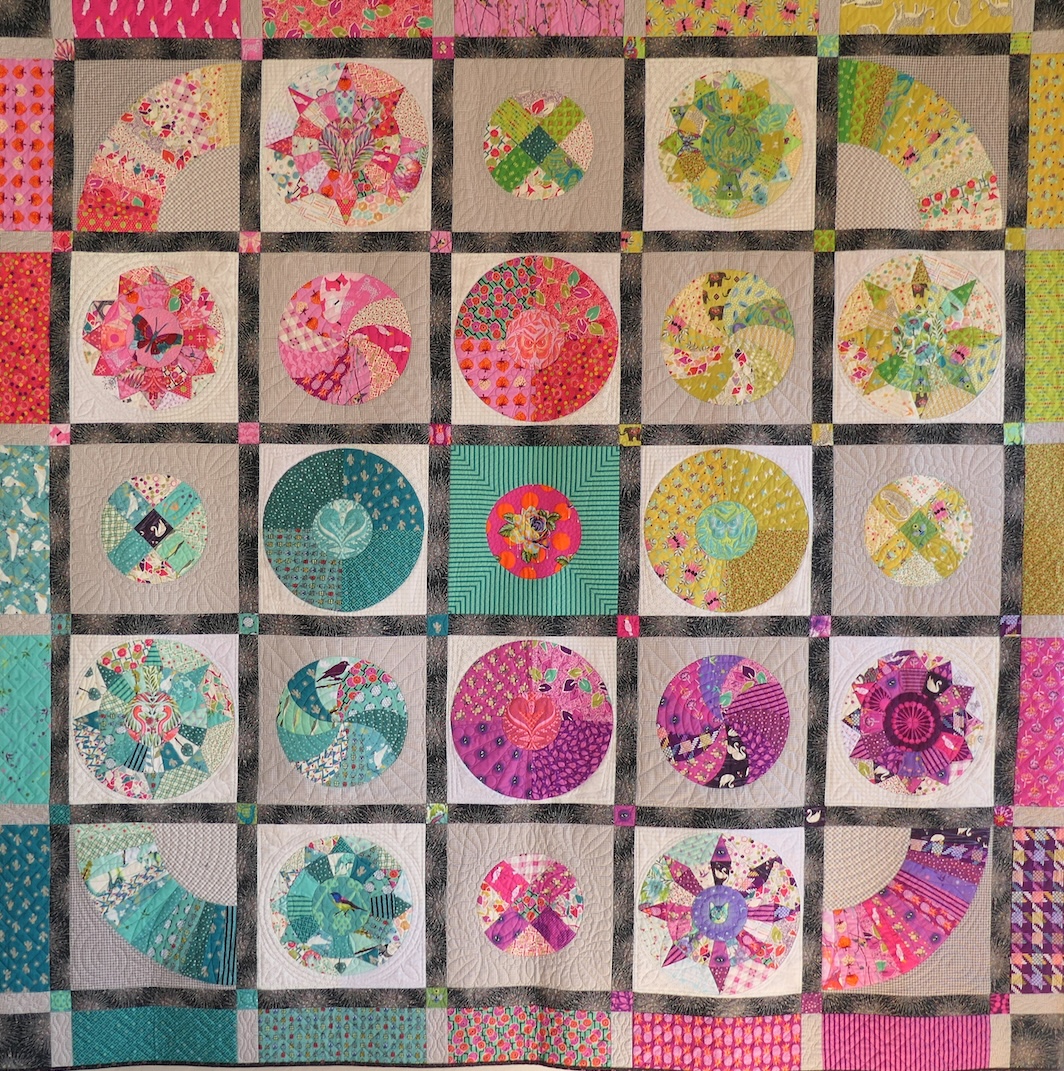I will be teaching 3 different quilts in this class, but they all have similarities. I love circular patterns, and these quilts all rely on mostly circular patterns inserted into squares. The class focusses on techniques that you will be able to use repeatedly. I love using lots of fabrics in a quilt too and if I run out of something I add another.