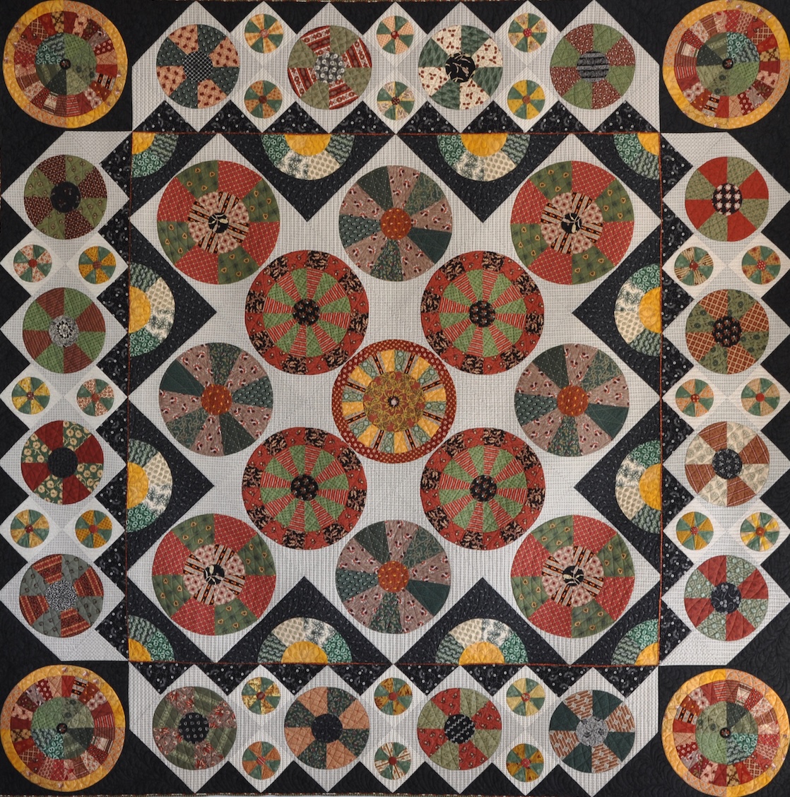 Propelled is a quilt that I designed in about 2005 and finished in 2009, and it is a big quilt at 235 cm square. It has interesting selection of reproduction style fabrics in madders, greens, shirtings and blacks.