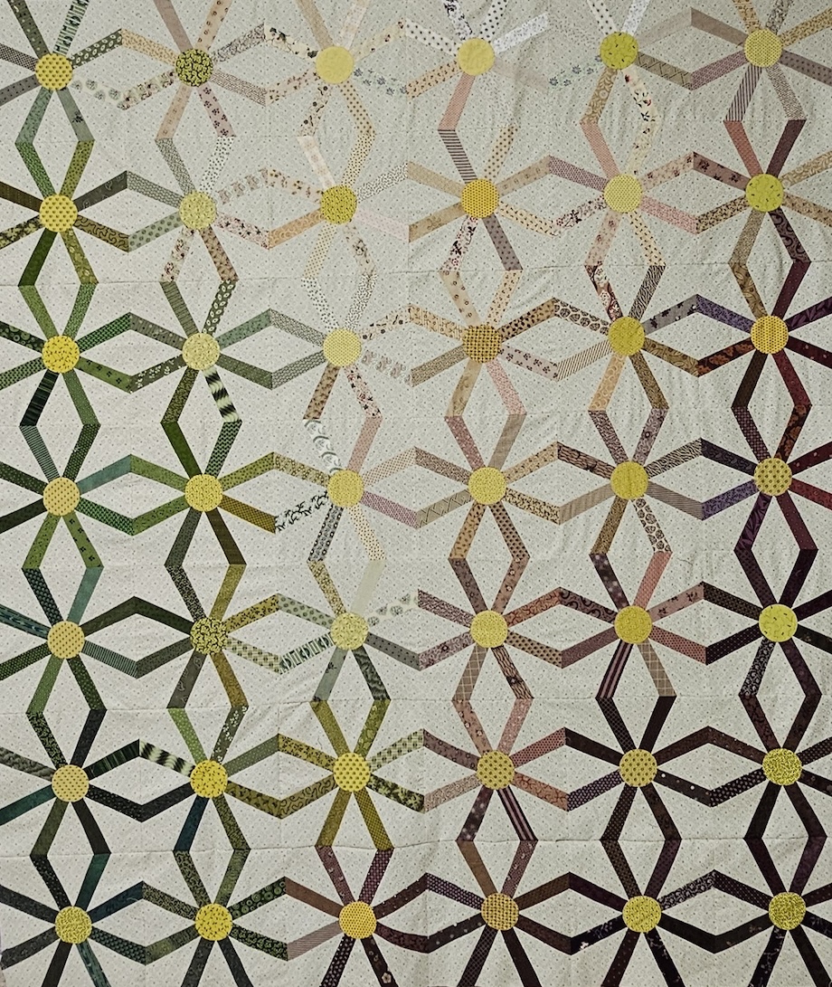 Another that has always been on my list, a design that works like an endless chain. Crossings began, as I was looking for a way to use a border fabric in a different way and uses a 7-inch block. The 2 days will give you time to ensure accuracy as there are 16 seams in a block and it does demand accuracy and problem solving. Boronia Blossoms is the same design but not on point and uses a 12-inch block. So you will need to choose the size you prefer working with and then your setting when pieced.