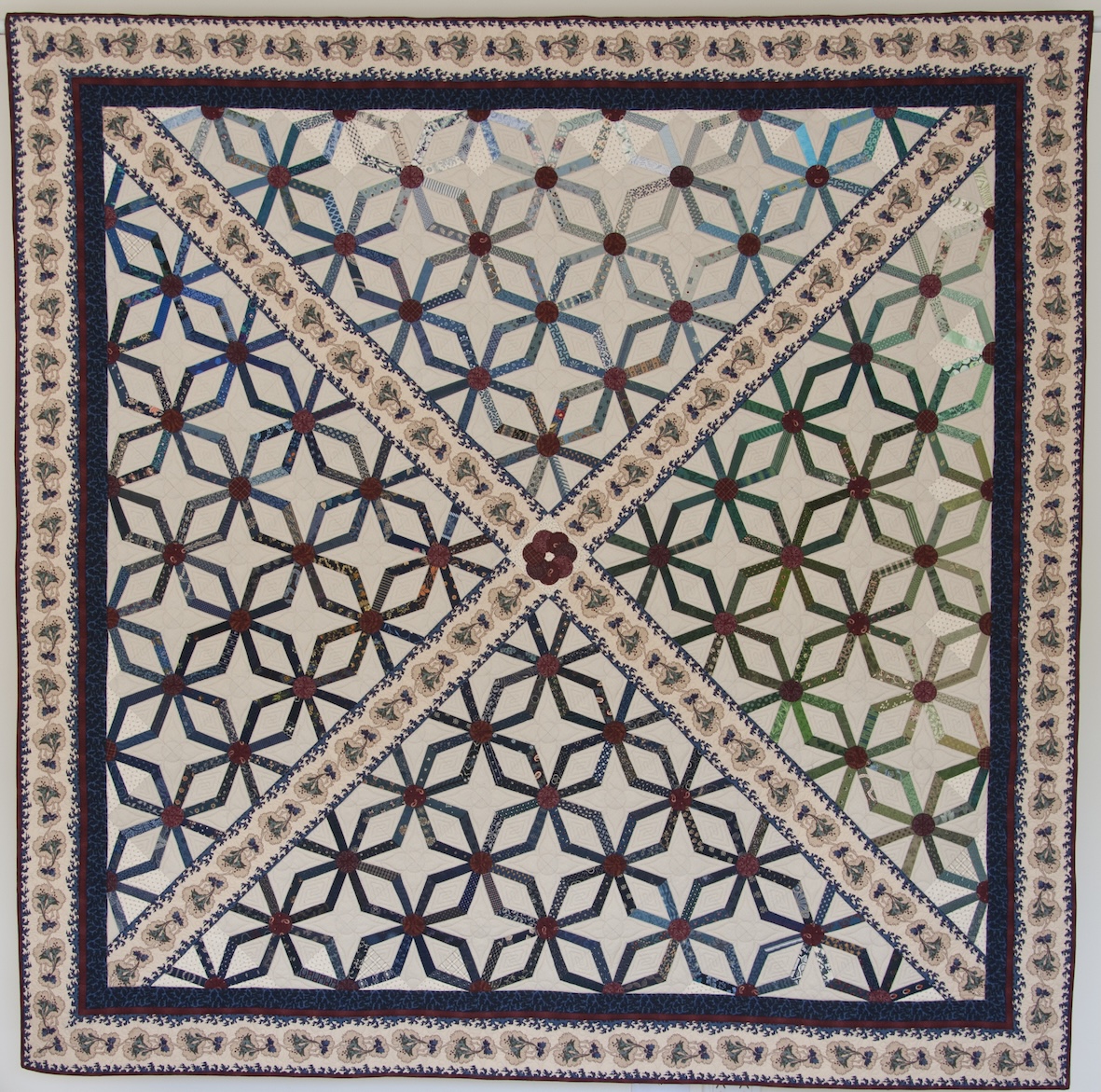 Propelled is a quilt that I designed in about 2005 and finished in 2009, and it is a big quilt at 235 cm square. It has interesting selection of reproduction style fabrics in madders, greens, shirtings and blacks.